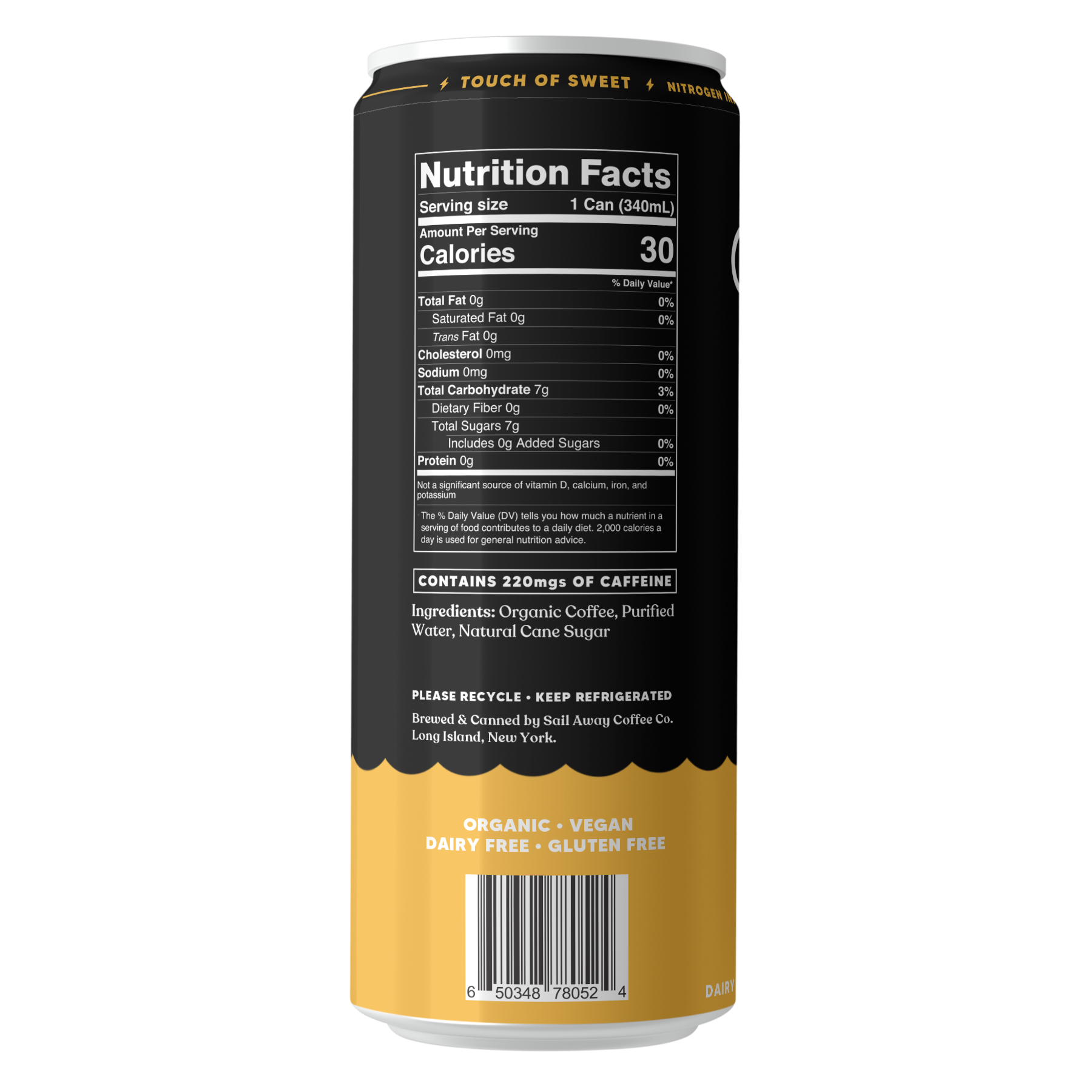 For those who like things just a little bit fancy, meet the perfect touch of sweetness, we've taken our classic cold brew and added a 'Touch Of Sweet'. ORGANIC, DAIRY-FREE, GLUTEN-FREE, and VEGAN formula. STAY BUZZED with 220mg of caffeine, equivalent to 3 espresso shots, providing clean energy for any time of day. WHAT'S NITRO? Immerse yourself in our unique brewing process, where nitrogen is infused into our cold brew, resulting in a cascading, creamy texture and an exceptionally smooth finish. For the authentic Nitro experience, simply shake, crack, and pour. SMOOTH & CREAMY perfection is achieved through our proprietary organic Central American blend, delivering the smoothest nitro cold brew. Revel in naturally sweet and chocolatey tones, with 60% less acidity than standard brews. ALL NATURAL INGREDIENTS, free from preservatives or artificial sweeteners.