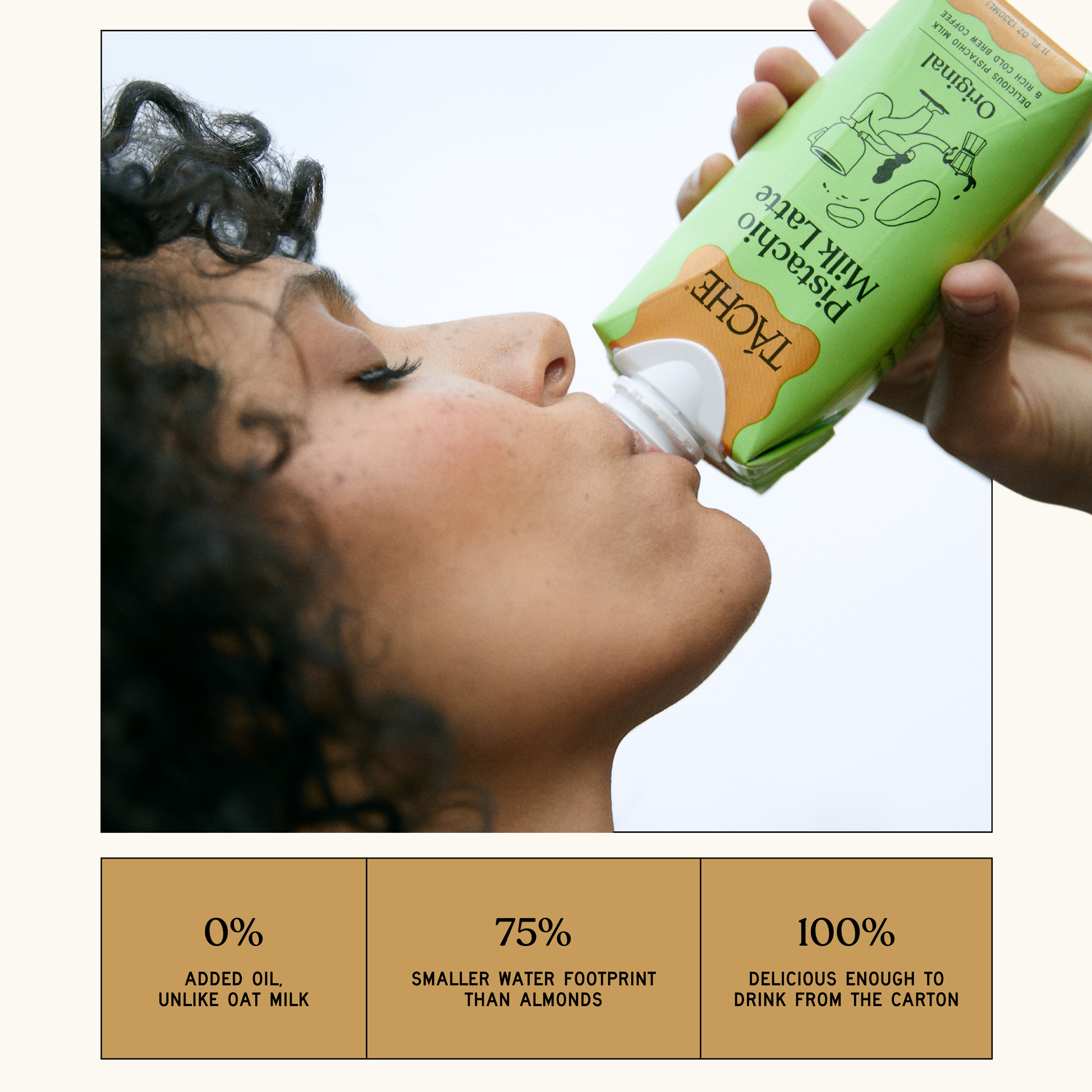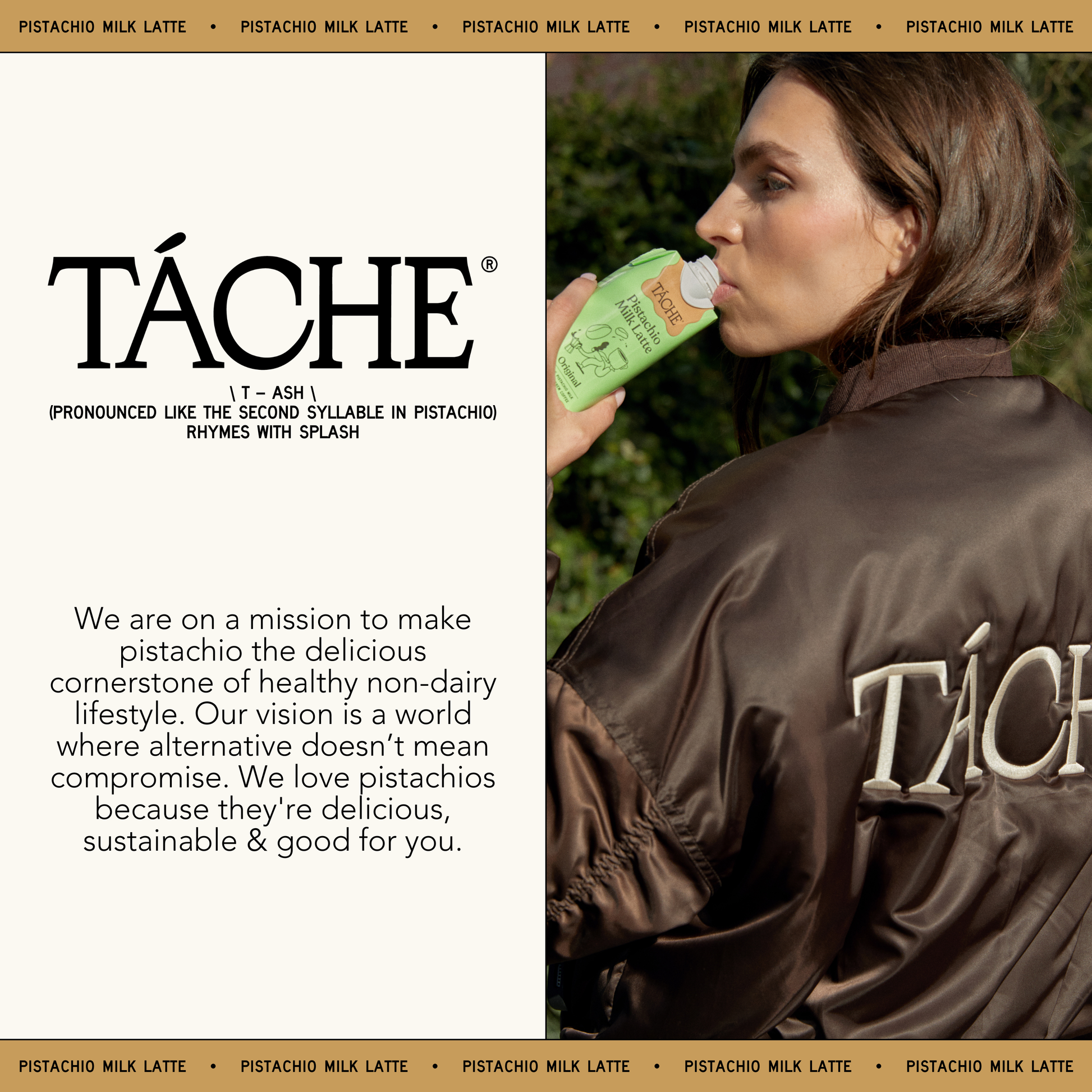 The first ever ready-to-drink Pistachio Milk Latte. A delicious, dairy-free latte made with 100% freshly brewed cold brew and lightly sweet & creamy pistachio milk. The Táche Pistachio Milk Latte is your go-anywhere, do-anything sip savior. 😋 BETTER TASTING: A little bit nutty and a little bit sweet with a velvety mouthfeel. Perfect in lattes, hot chocolate, and more. 🌱 BETTER FOR THE PLANET: Pistachio trees require 75% less water than almonds. 😊 BETTER FOR YOU: Unlike oat milk, Táche has no added rapeseed or canola oil. 📦 READY TO ENJOY: Táche is shelf stable with a shelf life of up to one year. Our lattes ship in cases of 12 x 11oz cartons. Pro tip: order in multiples of two cases for most efficient shipping. 🏃ON THE GO: Treat your guests to great taste on the go. Táche lattes are lightly sweetened and built for portability and are handbag ready.